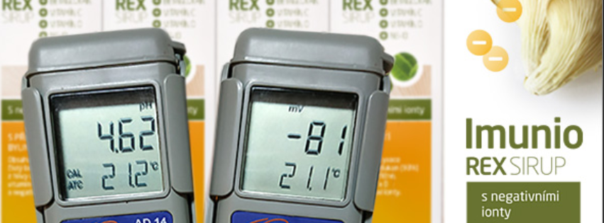 (obrázek měřidel - při kyselém pH - 4,62 si Imunio Rex udržuje výrazný mínusový náboj -81 mV, a to dlouhodobě - měřeno cca 1 rok od výroby. To je naprosto unikátní záležitost a fyzikální paradox!)